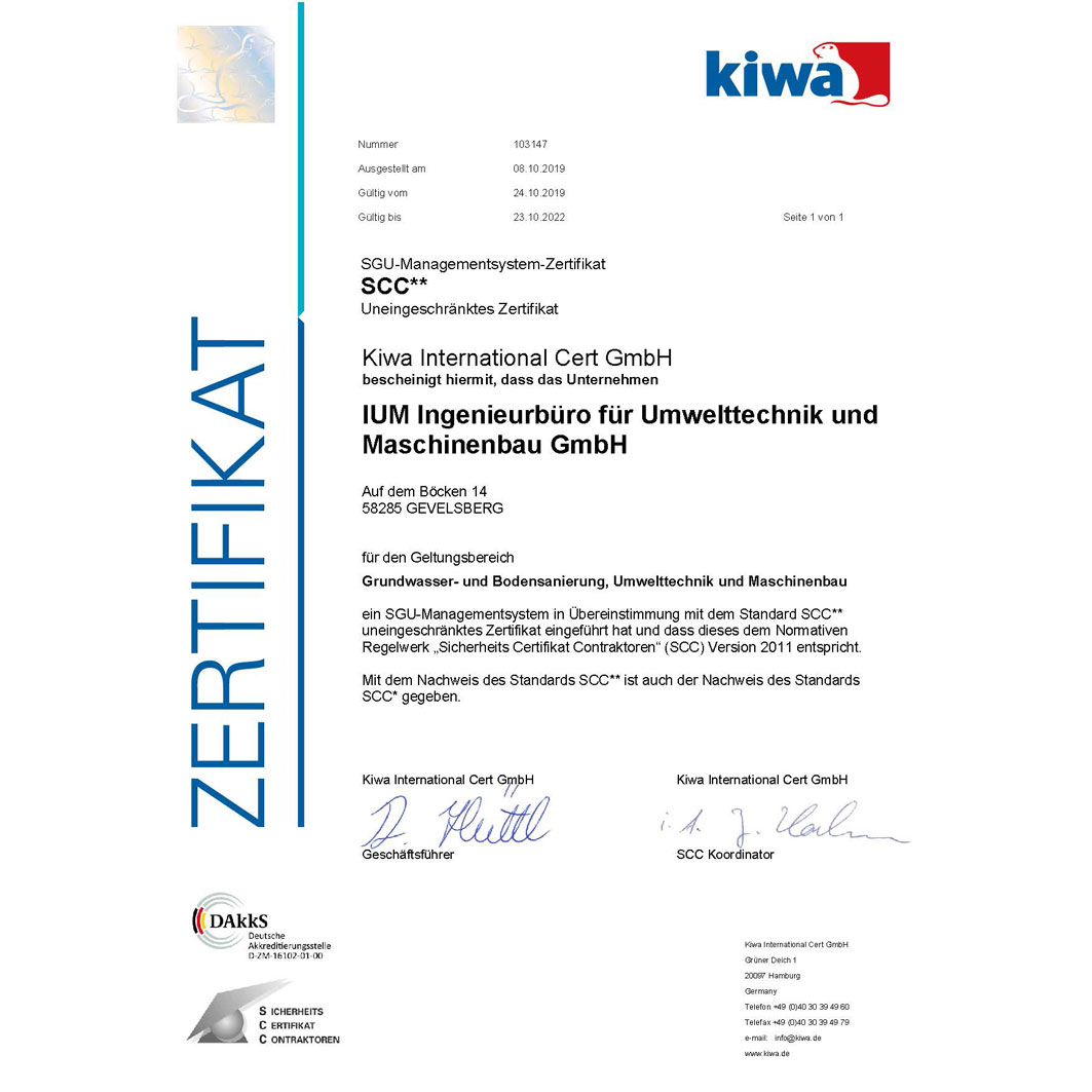 - SCC**-Zertifizierung (Sicherheitsmanagementsystem-Zertifikat Contractoren, uneingeschränktes Zertifikat)